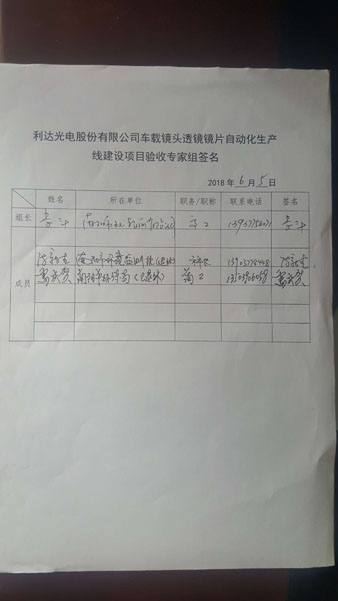 ???? 2018 年 6 月 5 日,利達光電股份有限公司根據利達光電股份有限公司車(chē)載鏡頭透鏡鏡片自動(dòng)化生產(chǎn)線(xiàn)建設項目竣工環(huán)境保護驗收監測報告,并按照《建設項目竣工環(huán)境保護驗收暫行辦法》,嚴格按照國家有關(guān)法律法規、建設項目竣工環(huán)境保護驗收技術(shù)規范/指南、本項目環(huán)境影響評價(jià)報告表和審批部門(mén)審批意見(jiàn)等要求,主持召開(kāi)了該公司車(chē)載鏡頭透鏡鏡片自動(dòng)化生產(chǎn)線(xiàn)建設項目環(huán)境保護竣工驗收會(huì )議。參加驗收會(huì )議的有項目建設單位(利達光電股份有限公司)、環(huán)評單位(南陽(yáng)市環(huán)境保護科學(xué)研究所有限公司)、驗收監測報告編制單位(鄭州譜尼測試技術(shù)有限公司)的領(lǐng)導、代表及邀請的專(zhuān)家共計 6 人,會(huì )議成立了項目竣工環(huán)境保護驗收組(名單附后),負責項目的驗收工作。