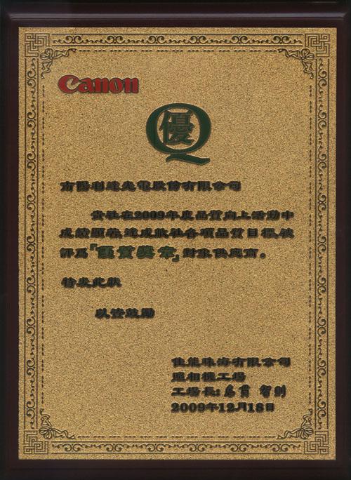 ??????? 12月18日,公司在佳能的供應(yīng)商“優(yōu)質(zhì)獎(jiǎng)?wù)隆北碚脙x式上受到表彰,并由佳能島貫工廠(chǎng)長(zhǎng)頒發(fā)了優(yōu)質(zhì)獎(jiǎng)?wù)伦C書(shū)。
