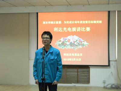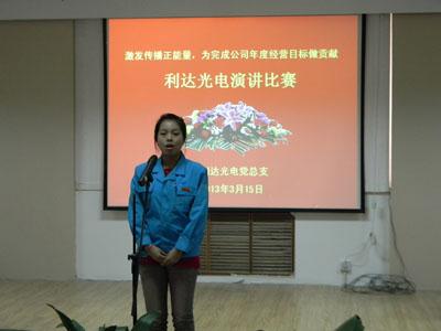 ??????? 為深入學(xué)習(xí)貫徹利達(dá)公司2013年經(jīng)營(yíng)工作會(huì)議精神,進(jìn)一步明確發(fā)展目標(biāo),統(tǒng)一全員思想,激發(fā)傳播正能量,推動(dòng)公司自我變革活動(dòng),在春暖花開、充滿希望的季節(jié),利達(dá)光電黨總支舉辦“激發(fā)傳播正能量,為完成公司2013年經(jīng)營(yíng)目標(biāo)做貢獻(xiàn)”演講比賽活動(dòng)。