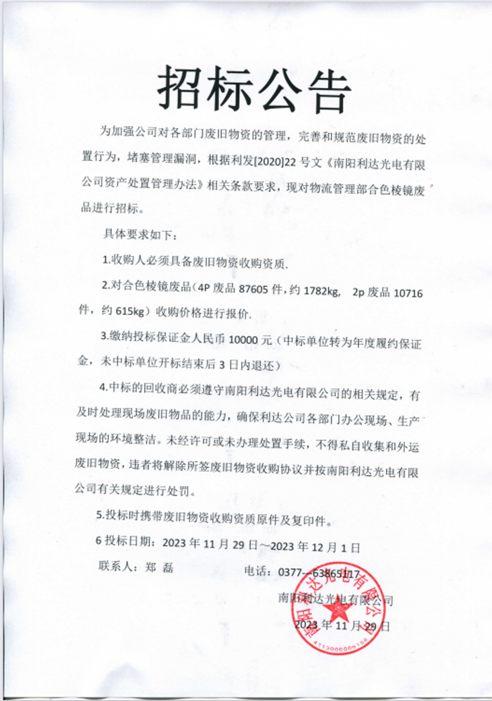 招標(biāo)公告(合色棱鏡)廢品招標(biāo)